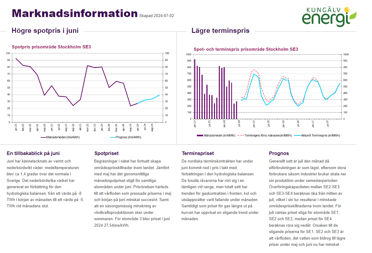 Nedan hittar du länken till marknadsinformation för elhandel, juli 2024. Kontakta gärna vår kundservice om du har frågor eller funderingar kring marknaden eller elavtal.
